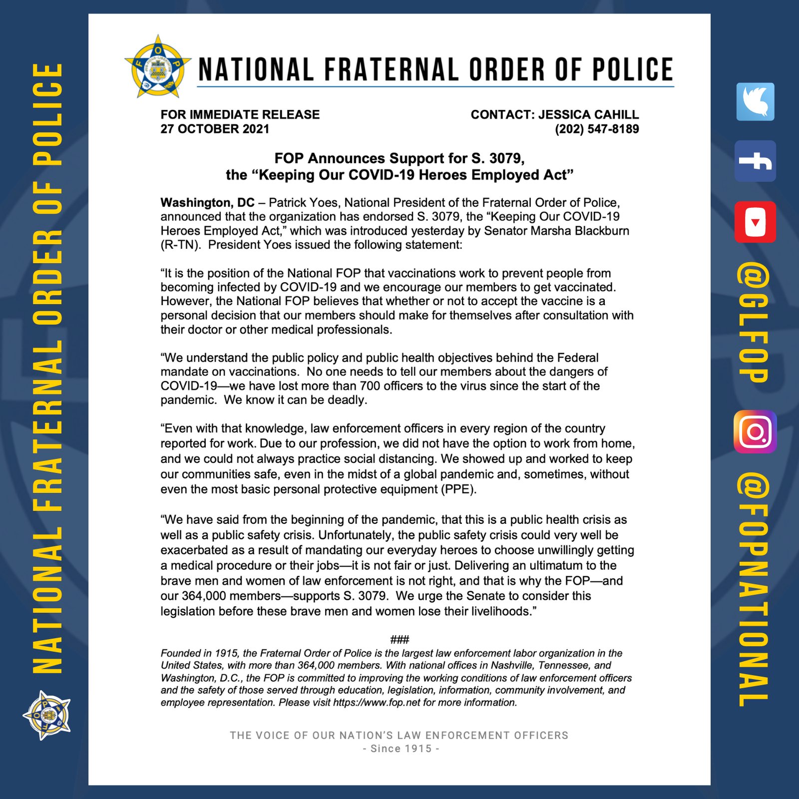 National Fraternal Order Of Police Fop On Twitter Largest Police Union Endorses The Keeping Our Covid 19 Heroes Employed Act Forcing Officers To Choose Between Unwillingly Get A Medical Procedure Or
